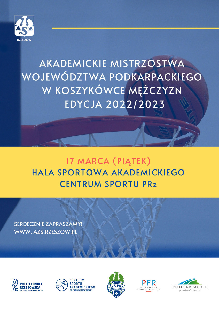 Już w najbliższy piątek zapraszamy na Akademickie Mistrzostwa Województwa Podkarpackiego w Koszykówce Mężczyzn, które odbędą się w hali sportowej Centrum Sportu Akademickiego Politechniki Rzeszowskiej.