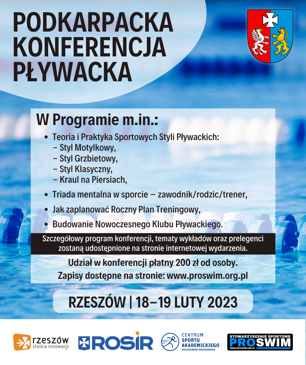 Centrum Sportu Akademickiego PRz był współorganizatorem Podkarpackiej Konferencji Pływackiej, której część teoretyczna odbyła się 18-19 lutego 2023 r na terenie Politechniki Rzeszowskiej. Głównym organizatorem było Stowarzyszenie POSWIM. Konferencja miała na celu zrzeszenie oraz solidaryzowanie środowiska pływackiego w województwie podkarpackim. Dwudniowe spotkanie skierowane zostało do trenerów, instruktorów, czynnych zawodników, oddanych rodziców oraz pasjonatów pływania. Chcieliśmy zaangażować jak najwięcej osób, którym zależy na rozwoju podkarpackiego pływania, podwyższaniu swojej wiedzy i umiejętności trenerskich. Jednocześnie liczymy, że dzięki konferencji - szkoły pływania i instruktorzy nieposiadający formalnych licencji wejdą w struktury Polskiego Związku Pływackiego i zwiększą konkurencję w województwie podkarpackim, aby pozytywnie wpłynąć na poziom organizacyjny i sportowy.