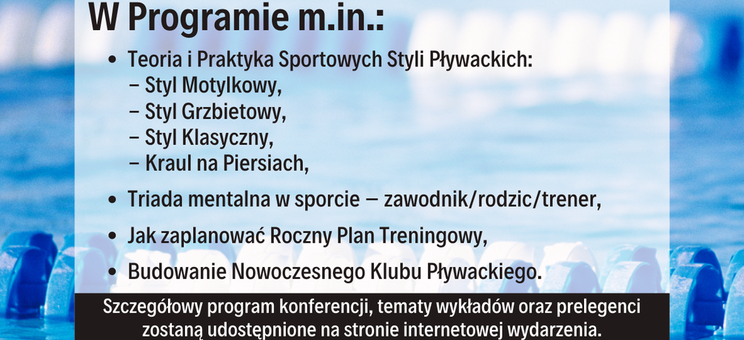 Głównym prelegentem podczas konferencji był Paweł Wołkow – trener pływackiej reprezentacji Polski Juniorów oraz klubowy trener w G8 Bielany, mający pod swoimi skrzydłami m.in. Radosława Kawęckiego czy Ksawiera Masiuka (multimedalistów największych imprez pływackich na świecie).