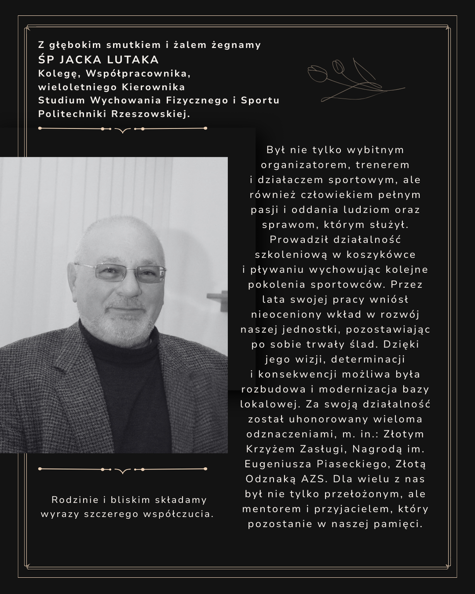 ŚP Jacek Lutak był nie tylko wybitnym organizatorem, trenerem i działaczem sportowym, ale również człowiekiem pełnym pasji i oddania ludziom oraz sprawom, którym służył. W 1974 r. ukończył Wyższą Szkołę Wychowania Fizycznego w Krakowie. Był pedagogiem, trenerem koszykówki i pływania, ratownikiem WOPR. W latach 1959-65 był zawodnikiem sekcji lekkiej atletyki CWKS Resovia, specjalizując się w biegach na dystansie 400m. Związany był również z pływaniem i koszykówką. Jako trener koordynator Rzeszowskiego Okręgowego Związku Pływackiego (1972-1980), instruktor ratownictwa wodnego oraz wiceprezes rzeszowskiego WOPR, szczególną wagę przykładał do kształcenia ratowników. Ponadto przez wiele lat trenował sekcję koszykówki mężczyzn AZS Rzeszów (1973-1997).