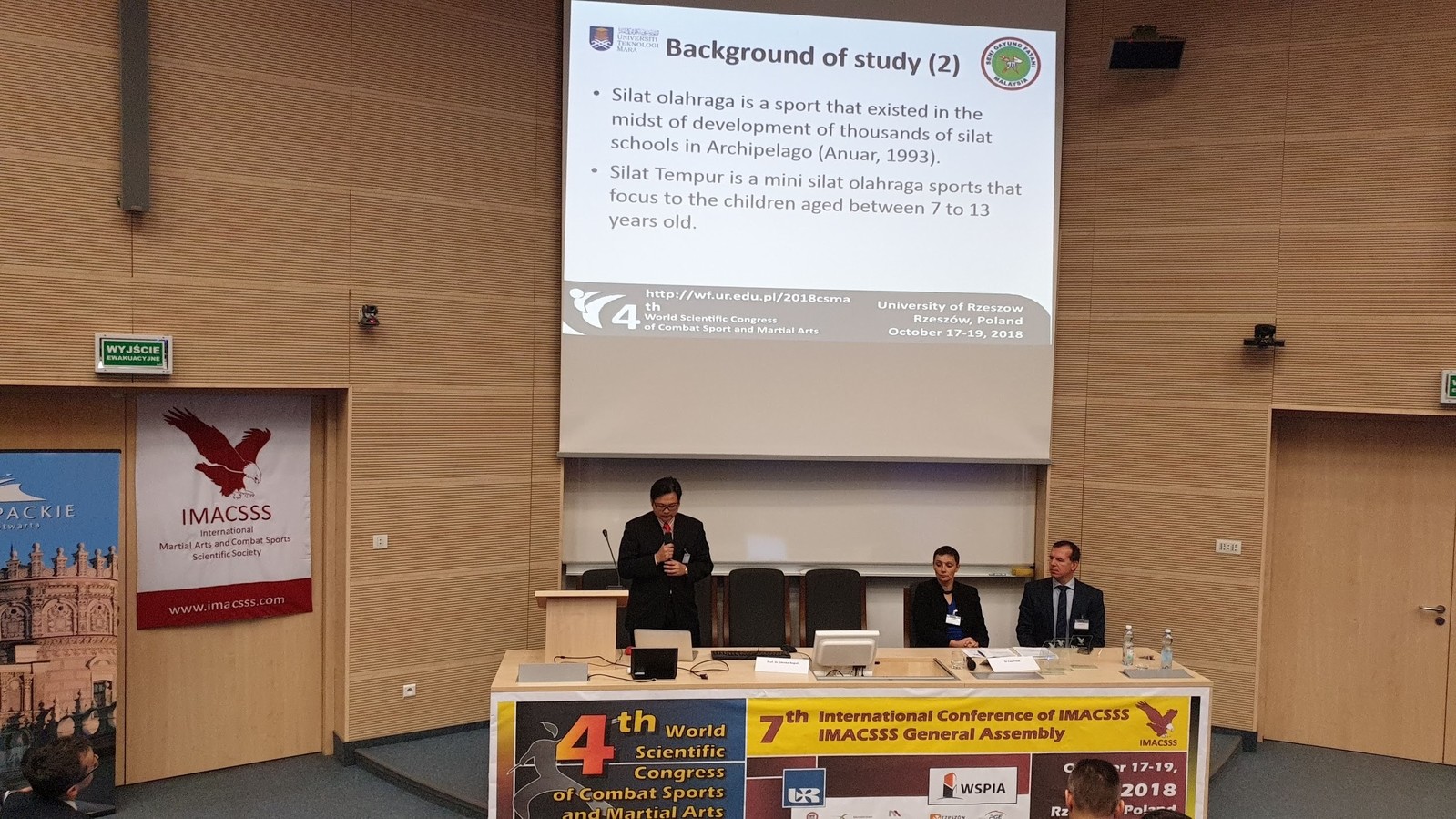 W dniach 17-19 październik 2018 r. w Rzeszowie odbył się Światowy Kongres Sportów i Sztuk Walki, który połączony został z 7 Konferencją Międzynarodowego Stowarzyszenia Naukowego Sportów i Sztuk Walki (International Martial Arts and Combat Sports Scientific Society - IMACSSS). W wydarzeniu tym, zorganizowanym przez Wydział WF Uniwersytetu Rzeszowskiego oraz Towarzystwo Naukowe IMACSSS uczestniczyli zarówno naukowcy, jak i praktycy wielu sztuk i sportów walki z niemal wszystkich kontynentów. W czasie trzech dni obrad prelegenci przestawiali wyniki swoich badań dotyczących m.in. kinezjologii, biomechaniki, psychologii, historii oraz traumatologii w sportach i sztukach walki uprawianych obecnie na całym świecie. W czasie Kongresu w obiektach Wyższej Szkoły Prawa i Administracji – Rzeszowskiej Szkoły Wyższej zorganizowano też warsztaty i pokazy technik sportów i sztuk walki. Swoje style zaprezentowali m.in. goście z Francji, Malezji, Ukrainy i Włoch. Polskę reprezentowali m.in. przedstawiciele szkoły szermierki staropolskiej Signum Polonicum z Zawiercia.